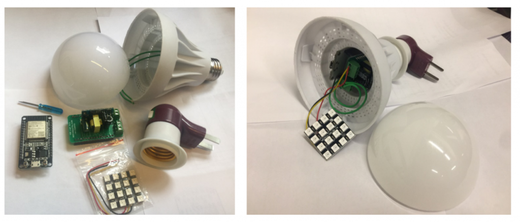 - 隨組即用套件: 燈泡半成品,程式已設定完成,只需自行組合燈泡外殼,連上Android App 設定WiFi連線,即可使用
